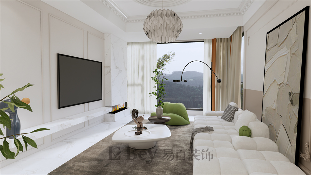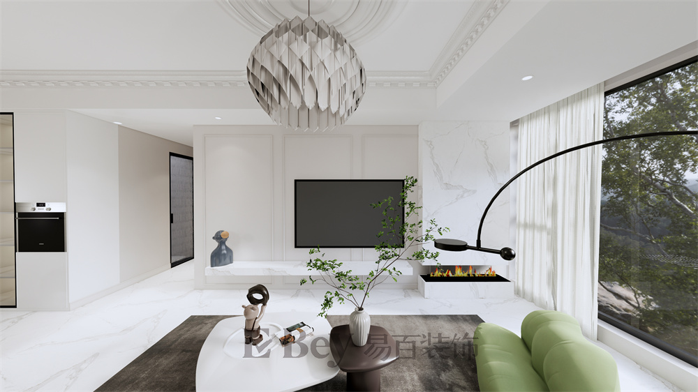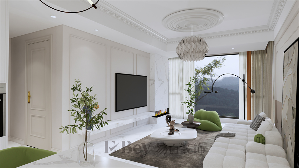 石膏線條的性價比很高,組合的方式也比較靈性,可以表達出法式風格的神韻,電子壁爐給家中增添溫馨、自然柔和的氣息。沙發背景墻利用色差的碰撞加入石膏線條給空白的大墻壁增添出了極簡法式的高級感。