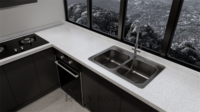 深色柜體搭配經典白色墻面,色彩分明且美觀,平整干凈的廚房空間,沒有一點雜亂感,讓人擁有簡潔的視覺感受。
