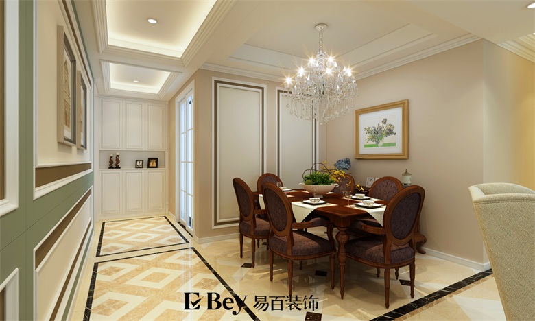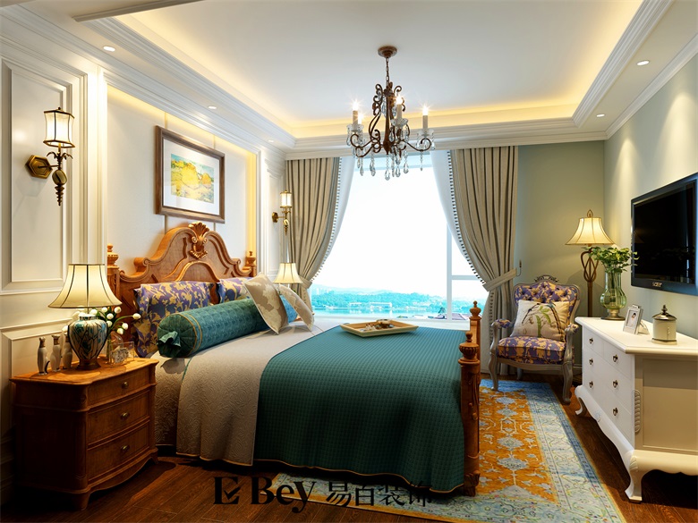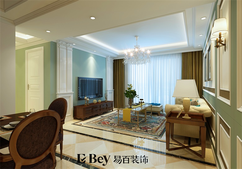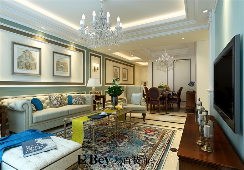 本套設計我是想讓設計給生活一些品味,經典的歐式元素融入空間,美式的掛畫,家具及擺設,讓空間有元素,通過這些元素讓房子更為貴氣。很多朋友都覺得家設計就必須要溫馨,其實溫馨不一定就要采用暖色調,那只是其中一種方法,本次設計我采用了大面積的冷色系列,清爽的灰綠色前面,老舊復古的沙發家具,總是給家一個獨特的氣質,讓生活更有味道,點綴配飾,讓空間更為活躍。